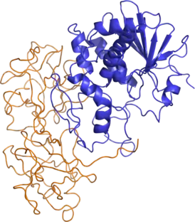 ![]() Пространственная структура рицина. Цепь А изображена синим цветом, цепь B — золотистым | |