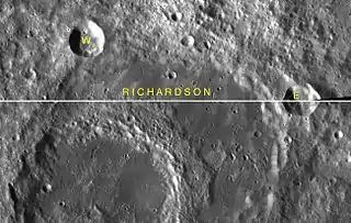 ![]() Снимок зонда Lunar Reconnaissance Orbiter. Кратер Ричардсон в центре снимка, его юго-восточная часть перекрыта кратером Максвелл, южная часть которого в свою очередь перекрыта кратером Ломоносов. | |