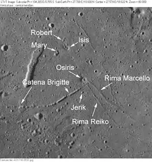 В непосредственной близости от кратера Роберт располагаются кратероподобные образования — Мария, Иерик, Осирис и Исис; а также борозда Марчелло; борозда Рейко и цепочка кратеров Бриджитт.