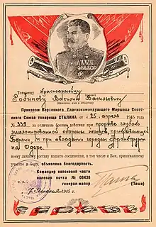 О его боевом пути говорят одиннадцать благодарностей Верховного Главнокомандующего за отличные боевые действия при освобождении городов: Смоленска, Ельни, при форсировании реки Днепр и освобождении города Шклов, при форсировании реки Неман и прорыве обороны противника на Западном берегу Немана, при освобождении города Каунаса, при прорыве обороны немцев на западном берегу Вислы южнее Варшавы (Польша), при овладении городами Томашов (Польша), Калиш (Польша), при вторжении в пределы Бранденбургской провинции Германии и овладении городами Швибус и Цюллихау (Германия), при прорыве глубокоэшелонированной обороны немцев, прикрывающей Берлин, и при овладении городом Франкфурт на Одере, при окружении и ликвидации группы немецких войск юго-восточного Берлина.
