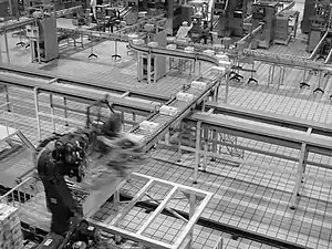 Роботизация — вытеснение людей из производительного процесса, с заменой их на автоматизированные и роботизированные станки и производственные линии, в связи с чем высвобождаются ресурсы для развития сферы услуг.[41]