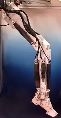 - Воздушные мышцы: Воздушные мышцы — простое, но мощное устройство для обеспечения силы тяги. При накачивании сжатым воздухом мышцы способны сокращаться до 40 % от своей длины. Причиной такого поведения является плетение, видимое с внешней стороны, которое заставляет мышцы быть или длинными и тонкими, или короткими и толстыми. Так как способ их работы схож с биологическими мышцами, их можно использовать для производства роботов с мышцами и скелетом, аналогичными мышцам и скелету животных[12][13].