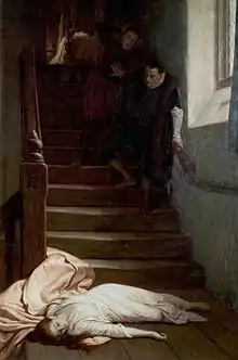 В воскресенье 8 сентября 1560 года Эми была найдена мёртвой у подножия лестницы в Камнор-плейс[58] со сломанной шеей[59]. Эми проснулась рано утром, и слуги отметили, что она была в странном настроении: почти сразу после пробуждения она объявила, что хочет остаться одна. В тот день в Абингтоне проходила ярмарка, и Эми посоветовала слугам идти туда, однако одна из престарелых дам, миссис Одингселлс, отказалась. Предположительно, Эми и сама собиралась отправиться на ярмарку, однако миссис Одингселлс сказала ей, что «воскресная ярмарка не то место, куда следует идти знатной женщине». Выслушав доводы миссис Одингселлс, Эми пришла в ярость, а на вопрос, кто же составит ей компанию за обедом, ответила, что это будет миссис Оуэн. В более поздних отчётах говорилось, что в момент смерти Эми миссис Оуэн и миссис Одингселлс играли в карты[60].