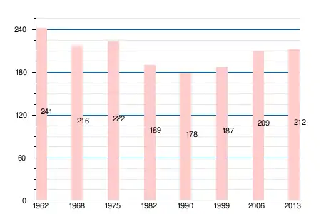 | 1962 | 1968 | 1975 | 1982 | 1990 | 1999 | 2006 | 2008 | 2011 | 2012 | 2013 |
