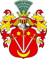 В красном поле три обнаженных меча, упирающиеся остриями в одну точку луны и расходящиеся рукоятками, между которыми помещёны две шестиугольные звезды. Нашлемник состоит из павлиньего хвоста.