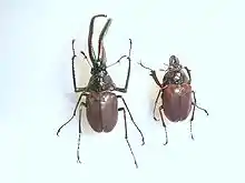 Длина тела самцов 60—85 мм[5]. Окраска тела варьирует, преимущественно тело золотисто-зелёного цвета с металлическим отливом, надкрылья — коричневые. Жвалы самца длиннее самого тела, расщеплены почти у основания и мелкозазубрены.