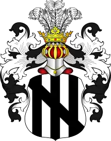В серебряном щите три чёрных столба, поверх чёрная перевязь влево.