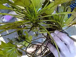 Стебель чилима находится под водой, развивается весной из плода и достигает поверхности воды. Имеет 3,6—5 м в длину. Корни зеленоватые, перисто-ветвистые, расположены на погружённом в воду стебле и имеют вид подводных листьев.