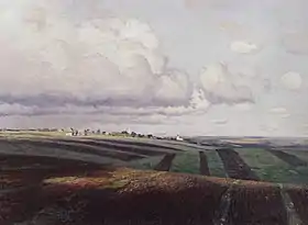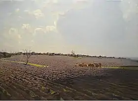 На переднем плане — участок вспаханной земли. Запряженные волы тянут плуг, за которым идёт крестьянин. Художник передаёт необъятность пространства полей, показывая перепаханные чёрные полосы, уходящие к горизонту. Вдали видны домики деревень. Бо́льшая часть поверхности земли покрыта тенью от о́блака, которая приглушает свежую зелень. Дальний план освещён солнцем — этот эффект усиливает впечатление бескрайности полей. Богатство и звучность колорита картины достигаются за счёт удачного выбора расположения освещённых и затенённых участков. Переданный эффект освещения «вносит в пейзаж декоративное начало, которое, однако, не вредит пластической выразительности образа, но ещё более усиливает могучую и широкую цветовую оркестровку всей картины»[18].