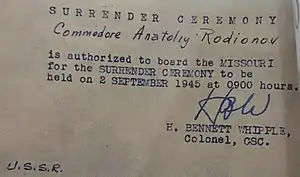 С января 1945 г. — военно-морской атташе при посольстве СССР в Японии. Присутствовал на подписании Акта о капитуляции Японии на борту американского линкора «Миссури».