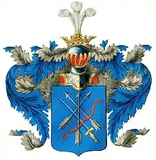 Описание герба: В щите, имеющем голубое поле, крестообразно изображены три серебряные стрелы, меч и красного цвета лук. Щит увенчан дворянским шлемом и короной со страусовыми перьями. Намет на щите голубой, подложенный серебром. |