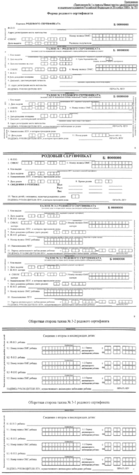 Родовой сертификат состоит из шести частей: регистрационной (корешок), четырёх талонов и собственно сертификата.