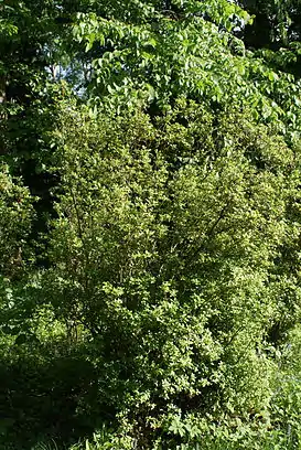 Полувечнозелёный ветвистый густолиственный кустарник высотой 0,5—2,0 м с направленными вверх ветвями. Кора стволов и ветвей тёмно-серая. Побеги тонкие, красно-бурые, молодые железисто-чешуйчатые и короткоопушённые.