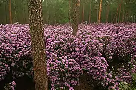 - 'Catawbiense Grandiflorum' Waterer A. (Knap Hill), до 1850 года). Достоверной информации о происхождении нет. Либо растение отобрано среди видовых сеянцев, либо является результатом гибридизации. В десятилетнем возрасте высота куста около 120—180 см. Соцветия шарообразные, сплюснутые, несут 12—19 цветков. Цветки цвета лаванды, с жёлто-красными отметинами. Тычинки фиолетово-коричневые. Аромат отсутствует. Выдерживает понижения температуры воздуха до −26…-32 °С[16][17]. В условиях умеренно-континентального климата зимостоек.[18].