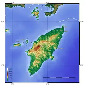 Родос — остров эллипсообразной формы, максимальная длина его — 77 км, максимальная ширина — 37 км. Пролив Карпатос шириной 47 км на юго-западе отделяет Родос от Карпатоса, пролив Родос шириной 37 км на северо-западе — от полуострова Бозбурун Малой Азии.