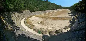 Родосский олимпийский стадион — античный олимпийский стадион 3 в до н. э. на острове Родос Додеканеса является единственным в мире полностью сохранившимся олимпийским стадионом — аналогом стадиона в Олимпии с центральным полем для бега на два стадия (дромос долихос — примерно 380 метров) и закругленным одним концом для единоборств, окруженным подлинными сиденьями и трибунами. Звук голоса слышен на 400 метров и к середине только усиливается. К востоку от стадиона находился гимнасий, от которого сохранились только руины.