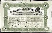 13 марта 1888 года Родс и Радд запустили De Beers Consolidated Mines после объединения ряда индивидуальных требований. Компания с капиталом в 200 000 фунтов стерлингов, секретарём которой был Родс, владела крупнейшей долей в руднике (200 000 фунтов стерлингов в 1880 году = 22,5 миллиона фунтов стерлингов в 2020 году = 28,5 миллиона долларов США)[30]. Родс был назначен председателем De Beers при основании компании в 1888 году[lower-alpha 1].