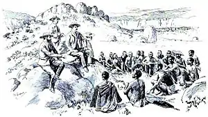 Когда Родс стал членом Парламента, главной целью собрания было помочь решить будущее Басутоленда[33]. Министерство Сэра Гордона Спригга пыталось восстановить порядок после восстания 1880 года, известного как Оружейная война. Министерство Спригга спровоцировало восстание, применив свою политику разоружения всех коренных африканцев к нации басуто. Это вызвало сопротивление.