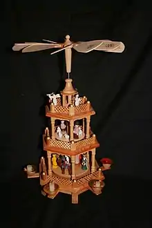 Часто на рождественских пирамидах изображаются ангелы или сцена Рождества, но также встречаются пирамиды с фигурками горняков, сценками из жизни леса или повседневной жизни жителей Рудных гор. Рождественская пирамида вращается благодаря поднимающемуся к лопастям тёплому воздуху от свечей, расставленных в пирамиде по кругу.