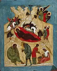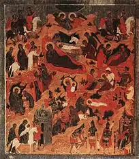 ![]() «Рождество Христово». Икона из праздничного чина иконостаса Благовещенского собора Московского Кремля. 1410-е (?) | |