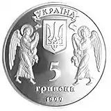 На аверсе монеты между двумя фигурами ангелов находится изображение малого Государственного герба Украины и надписи: «УКРАЇНА», «5», «ГРИВЕНЬ», «1999», и логотип Монетного двора Национального банка Украины.