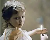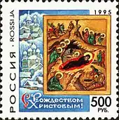 | Девочка держит в руках свечу на рождественском вечере, 7 января 1995 года | Рождественская марка России 1995 года с изображением иконы «Рождество Христово» (1497) из праздничного ряда иконостаса Успенского собора Кирилло-Белозерского монастыря | Будущий президент В. В. Путин в храме Троицы Живоначальной на Воробьёвых горах (6 января 2000 года) | Воспитанники воскресной школы в храме представляют историю Рождества Христова (Приморский край, 2011 год) |