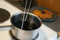 Также подают молочную рисовую кашу (фин. riisipuuroa), в которой прячут одно миндальное зерно (счастливому обладателю пророчат удачный год и крепкое здоровье).[44] Старое поверие о том, что тот, кто возьмёт первую ложку каши — умрёт в наступающем году — привело к традиции подавать кашу на стол с уже воткнутой в неё ложкой, которую затем откладывают в сторону.[15]