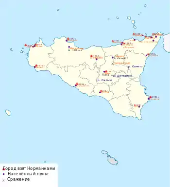 После взятия Палермо завоевание Сицилии растянулось ещё на 18 лет. Это было обусловлено незначительностью войск Рожера (обычно несколько сотен рыцарей) по сравнению с численностью арабского населения острова. В связи с этим, тактика норманнов состояла, с одной стороны, в многочисленных внезапных набегах на арабские селения и, с другой стороны, в переманивании арабских правителей, которые после признания власти Рожера либо оставались на своих постах, либо получали феоды в Калабрии. Крупномасштабные военные кампании предпринимались Рожером редко и, обычно, в тот момент, когда он был уверен в успехе. Невзирая на такую осторожную тактику, норманны трижды терпели болезненные поражения от арабов: летом 1072 года попал в засаду и героически погиб Серло Отвиль[64][65], в 1076 году в отсутствие Рожера его зять Гуго из Джерси предпринял поход из Катании на Сиракузы и был разбит сиракузским эмиром[66][67]; в 1081 году тот же эмир Сиракуз с помощью изменника овладел Катанией, впрочем вскоре отбитой отрядом Жордана и его двух соратников[66][68].