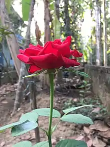 Длина цветоноса у садовых роз колеблется от 10 до 80 см[11]. Цветки роз удивляют своим многообразием. Их размеры колеблются от 1,8 см до 18 см, количество лепестков может составлять от 5 до 128, существует до десятка различных форм цветка, цветки могут быть как одиночные, так и в соцветиях от трёх до двухсот штук. Очень разнообразна цветовая гамма: нет только чисто-синих. Получен сорт зелёной розы, но он представляет интерес лишь для ботаников. Кроме однотонных существуют сорта роз с сочетанием окрасок, а также меняющие цвет в процессе цветения. Разнообразны ароматы различных видов и сортов роз. Кроме стандартного аромата дамасской розы, существуют розы с ароматом от фруктового и цитрусового до аромата благовоний и пряностей[13]. Махровость многочисленных сортов культурных роз возникла в результате превращения части тычинок в лепестковидные стаминодии.