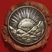 Значок Французской рабочей партии с изображением восходящего солнца, обрамлённого розовыми лепестками, 1893.