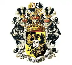 Щит разделён на четыре части, чёрные и золотые. Поверх разделения двуглавый орёл переменных с полями цветов с червлёными глазами, языками и когтями. На груди орла малый щиток. В нём в серебряном поле три чёрных охотничьих рога, украшенных золотыми кольцами и шнурами, соединённые мундштуками вместе.