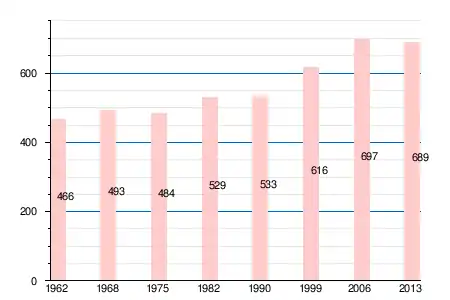 Население коммуны в 2011 году составляло 670 человек[6], в 2012 году — 680 человек[7], а в 2013-м — 689 человек[5].