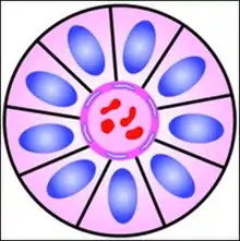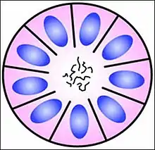 Розетка это клеточная структура, состоящая из клеток, окружающая центральное «ядро» в виде «колеса со спицами». Центр розетки может иметь кажущийся пустым просвет или быть заполненным цитоплазматическими отростками окружающих клеток. Цитоплазма каждой клетки розетки часто имеет форму клина, направленного в центр розетки, ядра клеток находятся на периферии и образуют кольцо или «нимб» вокруг розетки.[2]