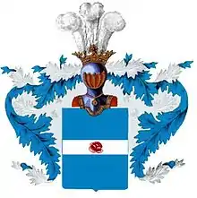 В голубом поле посередине означена горизонтально серебряная полоса с изображением на ней розы натурального цвета.