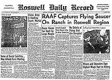 - 8 июля появились газетные публикации в газетах Розуэлла («Daily Record») и других изданиях к западу от Чикаго, в которых говорилось: «На ранчо вблизи Розуэлла захвачена летающая тарелка». Статьи были написаны на основании пресс-релиза, составленного офицером по связям с общественностью (Public Information Officer (PIO)) лейтенантом Уолтером Хотом. Пресс-релиз был составлен по приказу командира базы полковника Уильяма Бланшара[6];