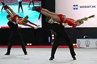| Тодес (горизонтальный, вертикальный). Лошадка. Сальто назад/вперед через партнера в контакте. Стульчик. Кугель. Дюлейн. Солнце. | |