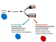 Данбар и Фугельсанг предполагают, что процесс открытия часто начинается, когда исследователь обнаруживает ошибки в своем эксперименте. Обычно такие неожиданные результаты заставляют исследователя искать ошибки в проведении эксперимента и пытаться исправить то, что, по его мнению, является ошибкой в его собственной методологии. Первая реакция — объяснить ошибку, используя локальные гипотезы (например, аналогии, типичные для данной дисциплины). Этот процесс также является локальным в том смысле, что ученый относительно независим от других учёных. В конце концов, исследователь решает, что ошибка слишком постоянна и систематична, чтобы быть простым совпадением. Исследователь перестаёт считать, что это ошибка в эксперименте, и используемые методы исследования становятся более широкими: исследователь начинает думать о теоретических объяснениях ошибки. Строго контролируемые аспекты научного метода, в том числе социальные, делают его подходящим для выявления постоянных систематических ошибок[2][10].