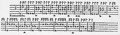 Термин впервые встречается в 1546 году в виуэльном сборнике испанского композитора Алонсо Мударры (Mudarra), где словом «романеска» названы вариации на чрезвычайно популярное в тогдашней Испании вильянсико Guárdame las vacas[1] (также в сборниках инструментальной музыки Л. Нарваэса, А. де Кабесона и многих других). Словом «Romanescha» названа анонимная пьеса (табулатура) в сборнике П. Фалеза «Carminum pro testudine liber IV» («Музыка для струнных инструментов. Книга 4»), опубликованном в том же 1546 году[2]. В Италии аналогичного рода композиции засвидетельствованы в сборниках лютневой и клавирной музыки Антонио ди Бекки (1568), Антонио Валенте (1576) и многих других старопечатных нотных сборниках, в рукописях Винченцо Галилея[3].
