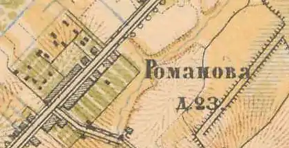 РОМАНОВА — деревня Царскославянского удельного имения, по просёлочной дороге, число дворов — 18, число душ — 71 м. п. (1856 год)[18]
