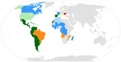 - бывшие колониальные страны (Африка (французский, испанский, португальский языки), небольшие территории в Южной Азии и Океании)[2].