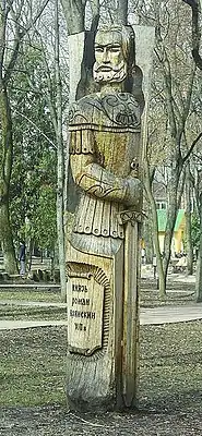 ![]() Скульптура «Князь Роман Брянский» (Парк-музей им. А.К.Толстого, автор — В.Орлов, 1978, дуб, Брянск) | |
