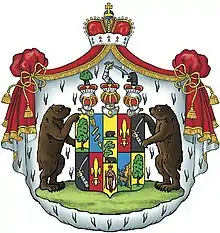 Щит разделён на десять частей, из которых в первой и десятой частях, в серебряном поле, изображено дерево дуб натурального цвета. Во второй части, в голубом поле, два золотых бруска и стрела, летящая сквозь них диагонально к левому нижнему углу. В третьей части, в золотом поле, медведь идущий по траве в левую сторону. В четвёртой и седьмой частях, в красном поле, означены серебром по одной лилии. В пятой и шестой частях, в чёрном поле, согнутая в латах рука с мечом, вверх поднятым. В восьмой части, в золотом поле, находится стародубский князь, имеющий в правой руке посох. В девятой части, в голубом поле, серебряный олень с ветвью во рту, бегущий направо из золотого леса. Сверх этих десяти частей, посредине щита в серебряном поле виден медведь, идущий к дереву, на правой стороне поставленному. Щит увенчан тремя шлемами с княжеской на каждой шапкой, из которых на первом видно дерево дуб, на втором — в латах рука с мечом, вверх поднятым, а на третьем — до половины выходящий медведь. Щитодержатели: два медведя. Весь щит покрыт мантией и шапкой, принадлежащими княжескому достоинству[3].