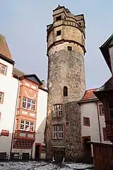 Изначальный вход в бергфрид в виде арочных ворот можно разглядеть со стороны двора на высоте около десяти метров. В средние века, по традиции, в башню можно было пройти только по разборной деревянной лестнице. Это гарантировало безопасность в случае нападения врагов. В те времена посетители попадали сразу на третий этаж. Два нижних этажа служили темницами и в качестве складских помещений. Верхние этажи могли быть жилыми. Нынешний вход в башню построили в XV веке. Окна в башне появились только в 1581 году. Внутри имеется винтовая лестница с 57 ступенями.