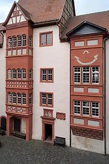 Со стороны двора дворец включает толстую каменную стену, которая входила в состав внешних укреплений с XIV века. Массивное четырёхэтажное здание имеет длину 32,5 метра и ширину девять метров. Сохранилась часть прежней богатой наружной отделки здания, включая изящные эркеры и высеченный из камня родовой герб владельцев.