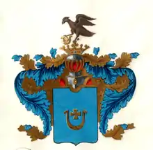 На щите дворянский коронованный шлем. Нашлемник: стоящий ястреб, держащий одною лапою означенную в щите золотую подкову с крестом, а на другой лапе виден колокольчик. Намёт на щите голубой, подложенный золотом[5].