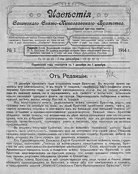 С 1 декабря 1914 года у Свято-Николаевского братства появилось своё периодическое издание «Известия Сочинского Свято-Николаевского Братства», в котором Россиев стал редактором[69][70][71].