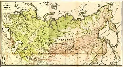 К 1914 году империя делилась на 78 губерний, 21 область и 2 самостоятельных округа, где расположен 931 город. Российская империя включала в себя следующие территории современных государств: все страны СНГ (без Калининградской области, южной и восточной частей Сахалинской области РФ; Закарпатской Ивано-Франковской, Тернопольской, Черновицкой (западной части) областей Украины); восточной и центральной Польши, Эстонии, Латвии, Финляндии, Литвы (без Мемельского края), несколько турецких и китайских районов[72][уточните ссылку]. Часть губерний и областей была объединена в генерал-губернаторство (Киевское, Кавказское, Сибирское, Туркестанское, Восточно-Сибирское, Приамурское, Московское). Бухарский эмират и Хивинское ханство были официальными вассалами, Урянхайский край находился под протекторатом. В течение 123 лет (с 1744 по 1867 гг.) Российской империи принадлежали также Аляска и Алеутские острова, а также часть Тихоокеанского побережья США и Канады.