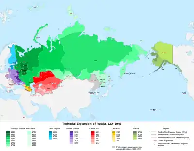 При императрице Екатерине Великой Россия, руководствуясь принципом «Отторженная возвратих», совместно с Пруссией и Австрией осуществила три раздела Речи Посполитой, в результате которых почти вся территория современной Белоруссии была присоединена к Российской империи; также успешно воевала с Турцией за выход к Чёрному морю, присоединила Крымское ханство (1783); старейшины Ингушетии заключили договор (1770) о принятии Ингушетии в российское подданство и переходе под российское покровительство[32]; в 1783 году Восточная Грузия, ведущая постоянные войны с турками и персами, находящаяся под угрозой полного уничтожения и частично оккупированная Османской империей попросила защиты у христианской России, подписала Георгиевский трактат и добровольно вошла[33] в состав Российской империи на правах протектората, что обеспечило мир на её территории и в дальнейшем способствовало отмене крепостного права; в 1801 году Восточная Грузия стала российской губернией. В результате русско-турецких войн к 1872 году вся территория современной Грузии, а также Абхазия вошли в состав России.