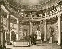 В основу иностранного фонда Императорской Публичной библиотеки легла коллекция книг и рукописей братьев Залуских — Библиотека Залуских. В 1809 году А. Н. Олениным было составлено первое в России пособие по библиотечной классификации[8]; по его указанию в том же году был произведён подсчёт библиотечного фонда, в котором оказалось 262 640 книг, 12 тысяч рукописей, 24 754 эстампа и только 4 книги на русском языке. На основе доклада Оленина М. М. Сперанским было составлено «Положение об управлении Императорской Публичной библиотекой», утверждённое 14 октября 1810 года императором Александром I — первый российский библиотечный законодательный акт, содержавший пункт об обязательной доставке в библиотеку двух бесплатных экземпляров любой печатной продукции, издаваемой в России[9]. Первый устав Публичной библиотеки, разработанный Олениным был утверждён 23 февраля 1812 года; им был определён штат библиотеки: 7 библиотекарей, 7 помощников, хранитель рукописей и его помощник, 2 писца и 13 сторожей. Планировалось открыть библиотеку в 1812 году, однако из-за войны с Наполеоном самая ценная часть собрания была эвакуирована из Санкт-Петербурга в Олонецкую губернию (189 ящиков находились некоторое время в деревне Устланке), и открытие пришлось перенести на два года. Торжественное открытие Императорской Публичной библиотеки состоялось 2 (14) января 1814 год и было приурочено к первому посещению её императором Александром I.