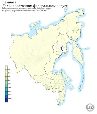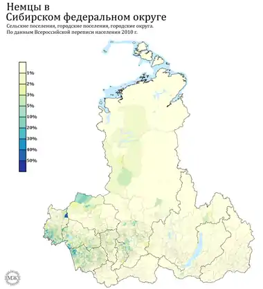 Кроме того, со второй половины XIX века немцы начинают принимать активное участие во внутрироссийском миграционном движении на многоземельные восточные и южные окраины империи. По данным переписи 1926 года, в Сибири и на Дальнем Востоке проживает 81 тыс. (главным образом в Омском округе — 34,6 тыс., и в Славгородском округе — 31,7 тыс.), в Казахстане — 51 тыс. немцев[9].